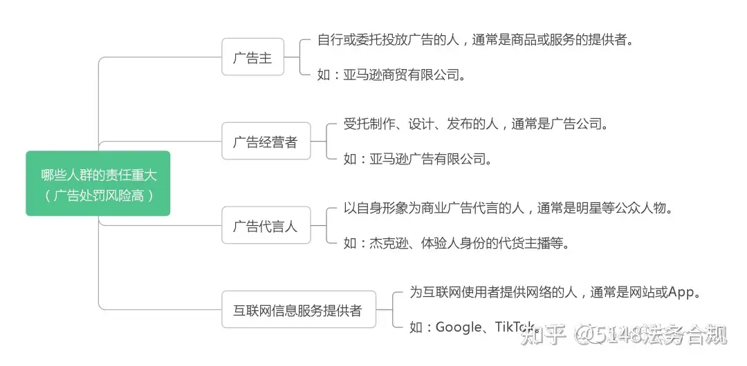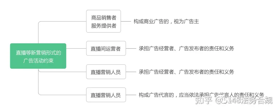 从《办法》第二十条的行政处罚管辖原则来看,广告主、广告经营者、广告代言人以及互联网信息服务提供者(包括直播行业相应的对位要求)这几类主体无疑应当引起高度注意。笔者以图例表示如下: