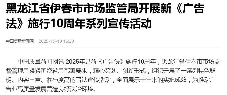 中国质量新闻网讯 2025年是新《广告法》施行10周年,黑龙江省伊春市市场监督管理局紧紧围绕省局部署要求,精心策划、创新形式,组织开展了一系列特色鲜明、内容丰富、参与度高的普法宣传活动,全面展示十年来的实施成效,为推动广告业高质量发展营造良好法治环境。