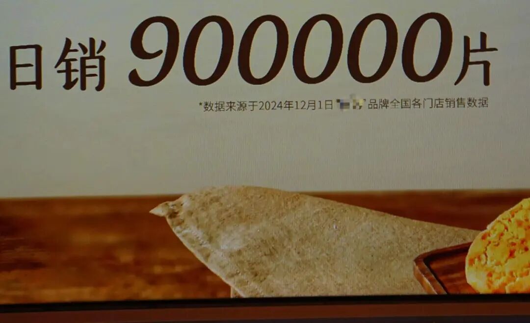 商场里,有桃酥店在店铺广告里以大字宣传“日销900000片”。小字则解释为:数据来自该品牌2024年12月1日全国各门店销售数据。