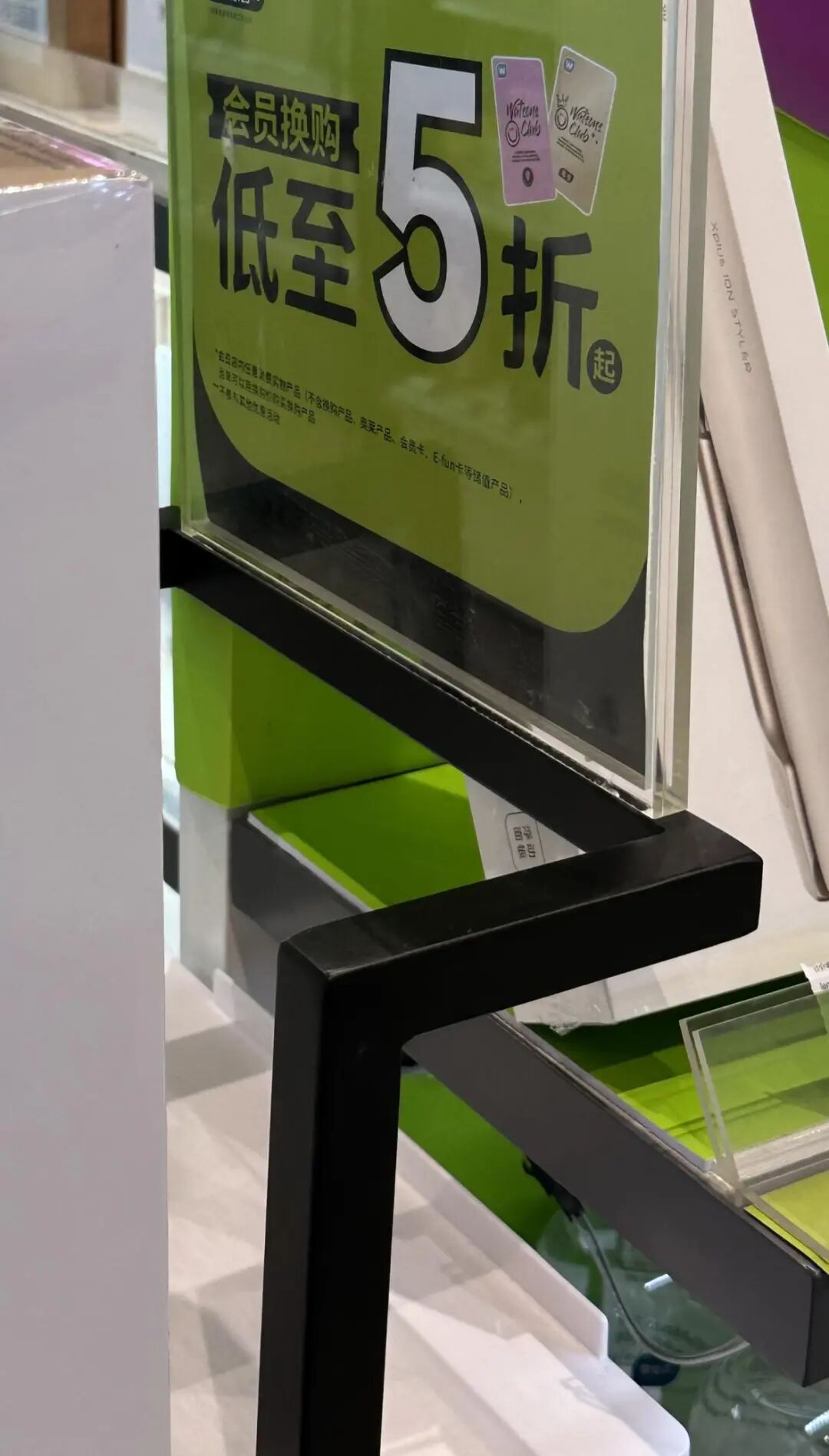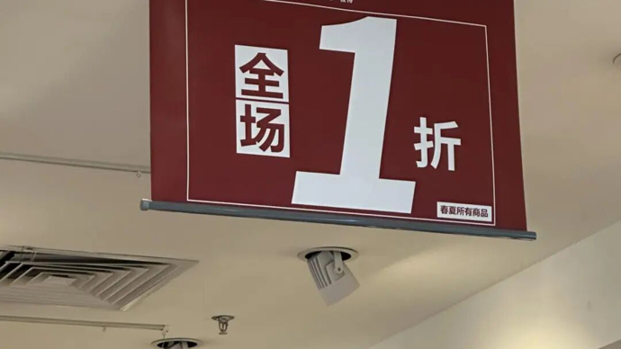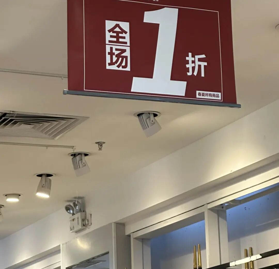 而此时,再回头看“全场1折”的宣传牌,其实右下角还有一行小字,写着“春夏所有商品”,虽然用白框标注着,但要是不注意,只是匆匆一瞥,很难发现,尤其是设置在门店顶部的牌子,更难看到。此外,记者注意到,在该店入口处地面上的另外一个宣传贴纸上,写着“臻享优惠,2折封顶”,但其下方,还写有一行小字,写着“一口价商品不参与,解释权归店铺独享”,不仅不容易让人注意到,一个“独享”还显得有些不“友好”。